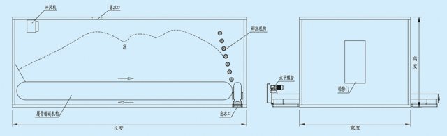 履带式自动储冰库的设计采用“先进先出”的原则,即先制出来的冰先送入库,用冰时先入库的冰先送出库,从而避免了冰库长期使用后底部出现结冰的现象。